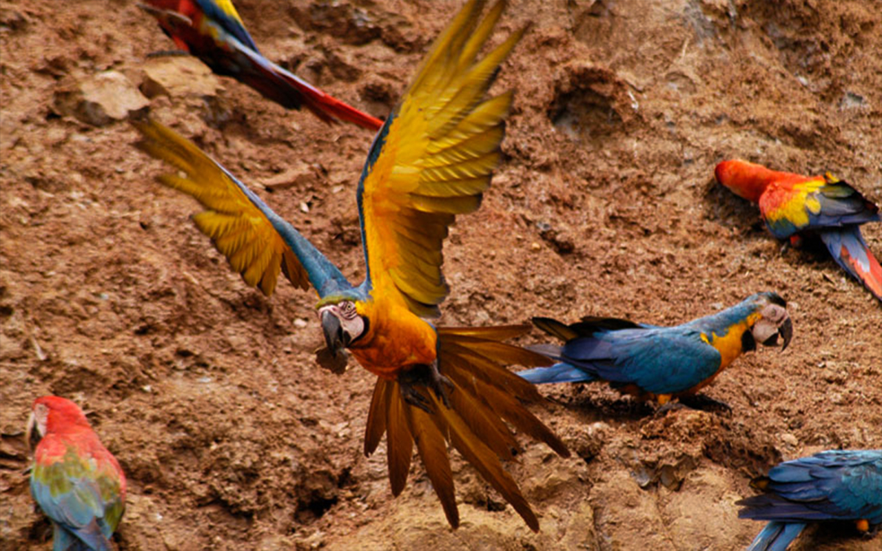 Very early in the morning, we will board our boat and head to the macaw clay lick, a wall along the river bank where different species of parrots, such as the blue-headed parrot, the white-eyed parakeet, the macaw with chestnut front, among others, meets every morning.